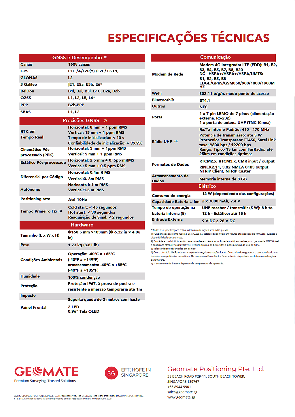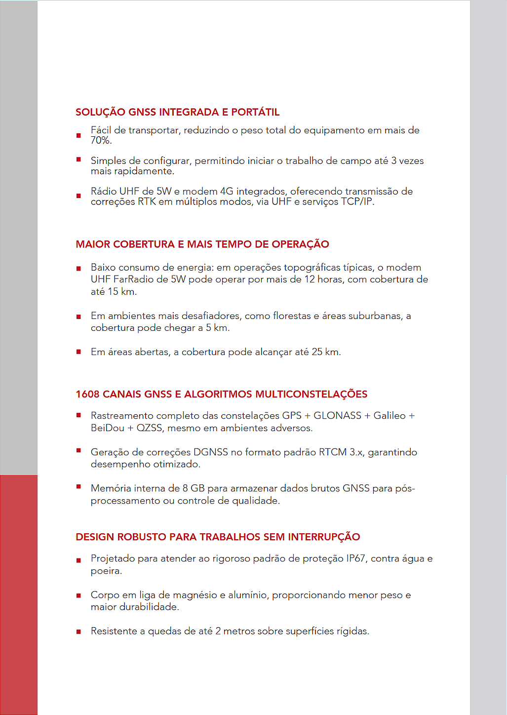 | SOLUÇÃO GNSS INTEGRADA E PORTÁTIL - Fácil de transportar, reduzindo o peso total do equipamento em mais de 70%; - Simples de configurar, permitindo iniciar o trabalho de campo até 3 vezes mais rapidamente; - Rádio UHF de 5W e modem 4G integrados, oferecendo transmissão de correções RTK em múltiplos modos, via UHF e serviços TCP/IP. |