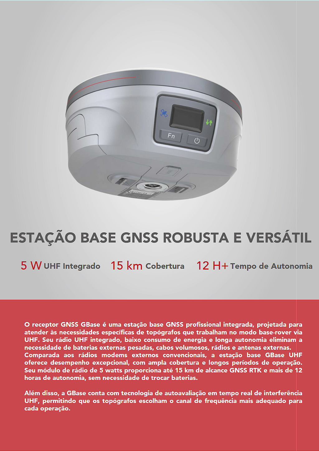 A GBase é um receptor GNSS profissional, compacto e integrado, ideal para operações topográficas no modo base-rover via UHF. Com rádio interno de 5 W, modem 4G, bateria interna de longa duração e 1608 canais multiconstelação, oferece cobertura de até 25 km e autonomia superior a 12 horas. Projetada para reduzir peso, cabos e dependência de equipamentos externos, a GBase garante máxima mobilidade, robustez e desempenho.