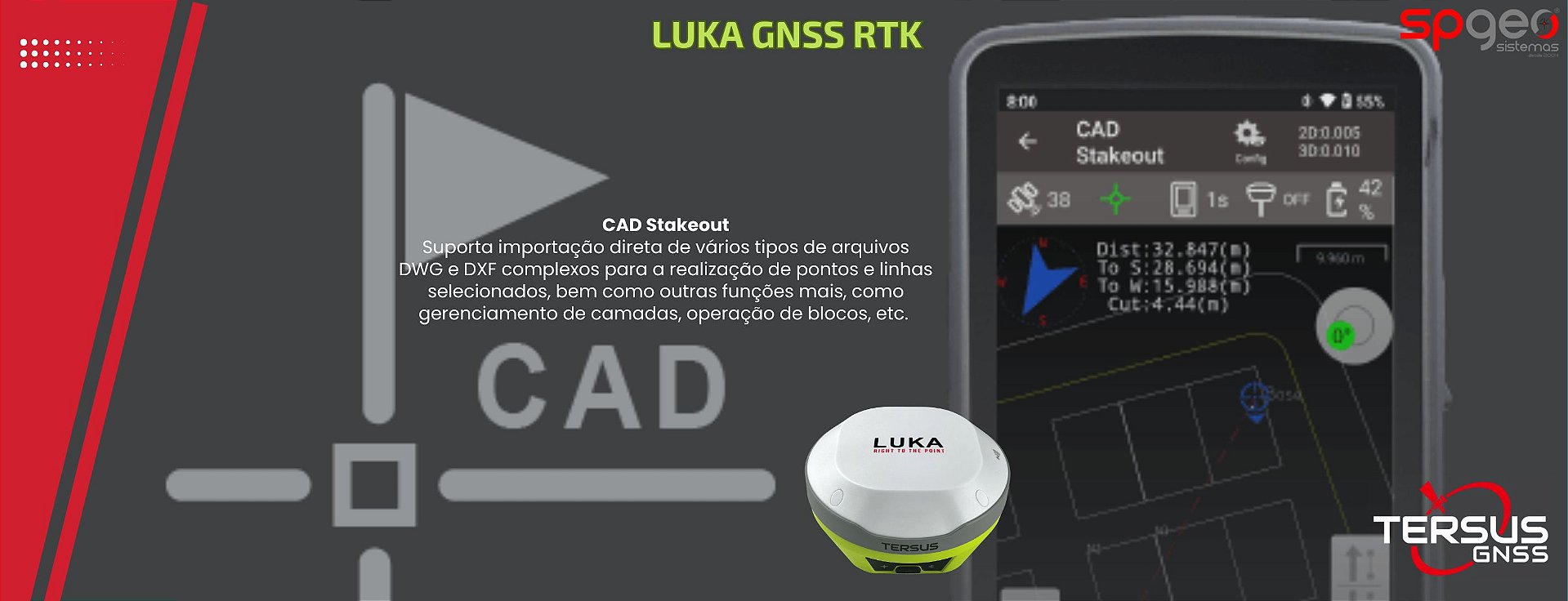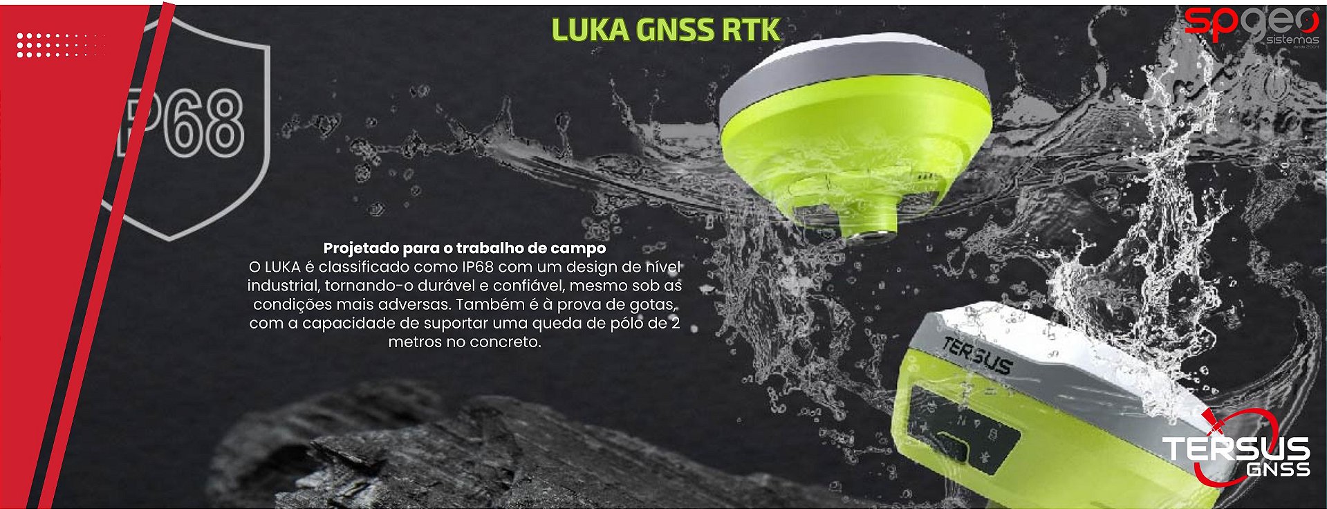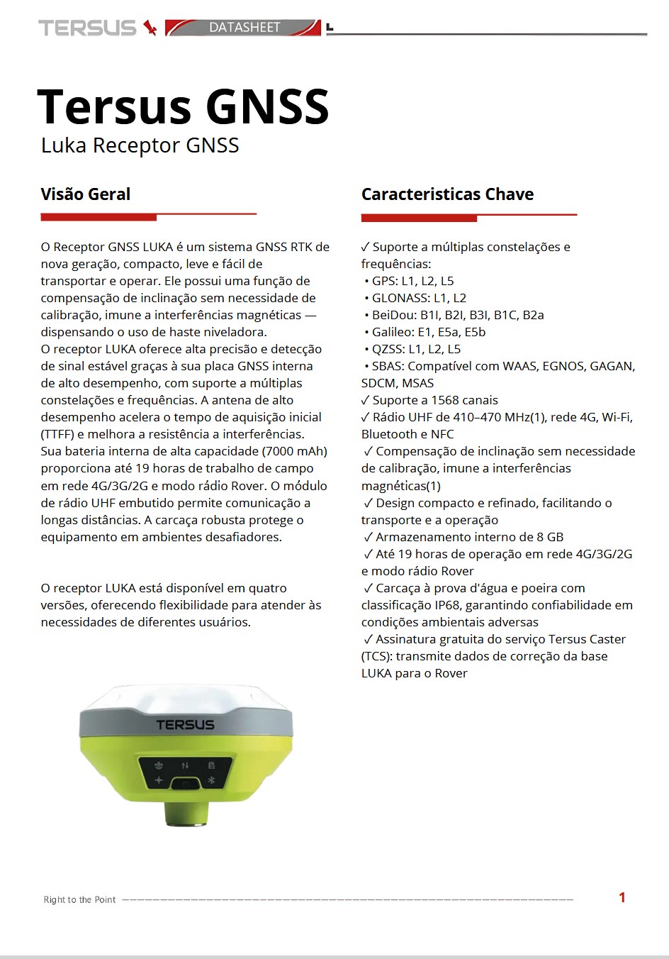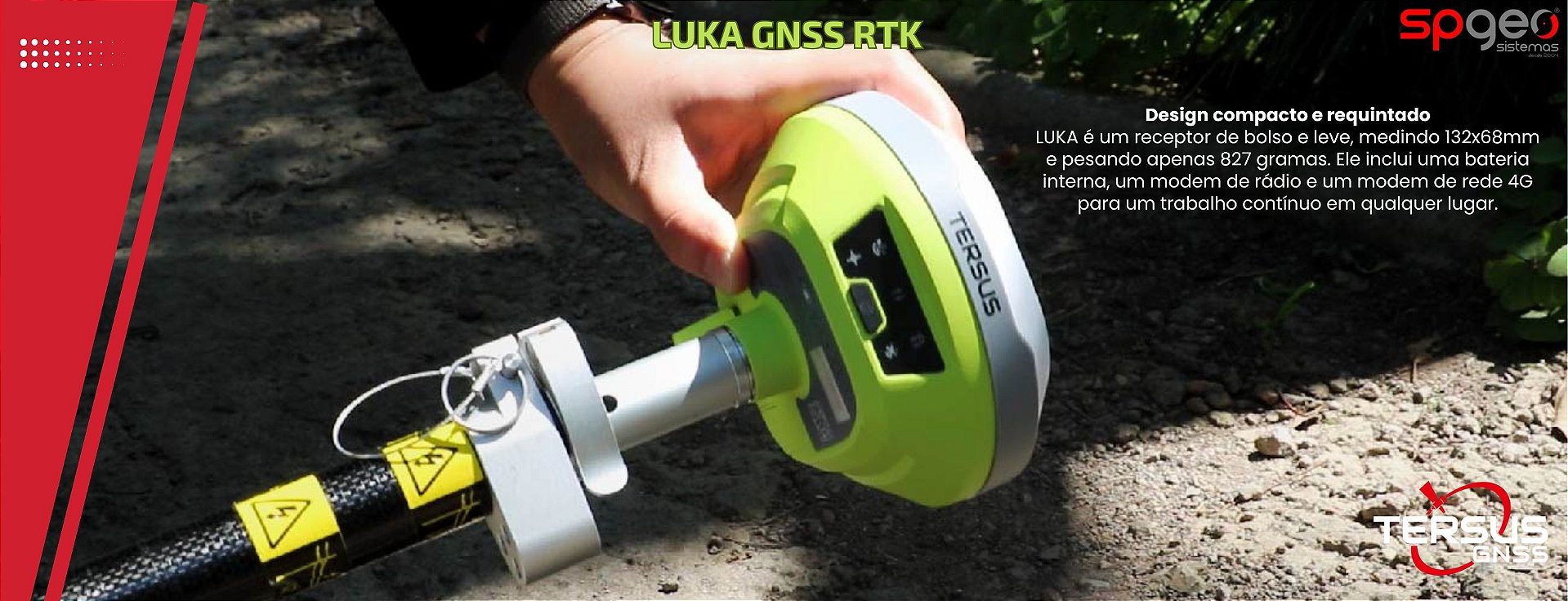 O compacto LUKA é um receptor GNSS RTK com IMU integrado e compensação de inclinação sem necessidade de nivelamento, ideal para uso em campo intensivo. Mede apenas 132 × 68 mm, pesa cerca de 827 g e inclui rádio interno, 4G, Wi‑Fi e bateria de longa duração .