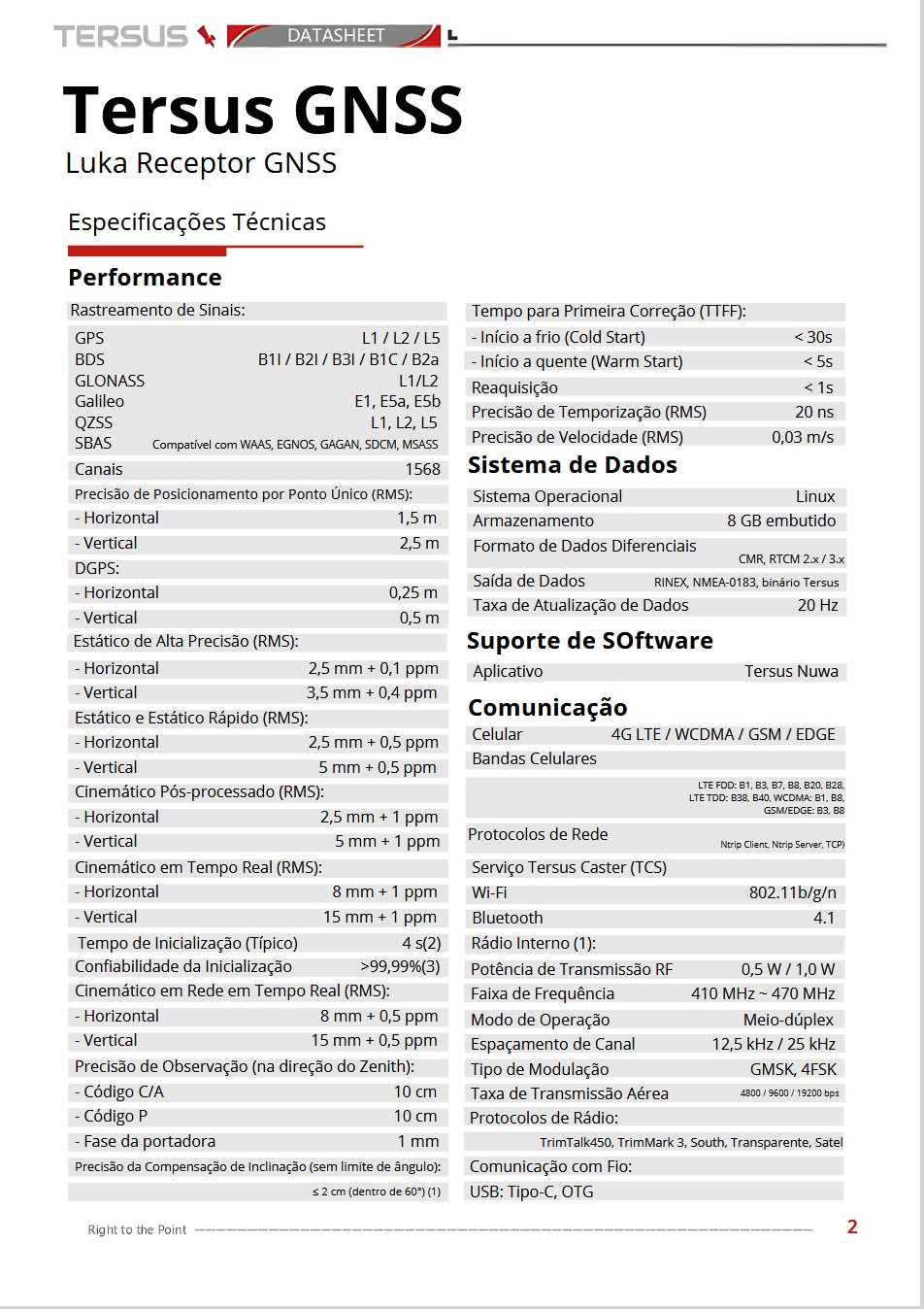 Precisão: RTK H ≤8 mm + 1 ppm; V ≤15 mm + 1 ppm; fix em segundos;