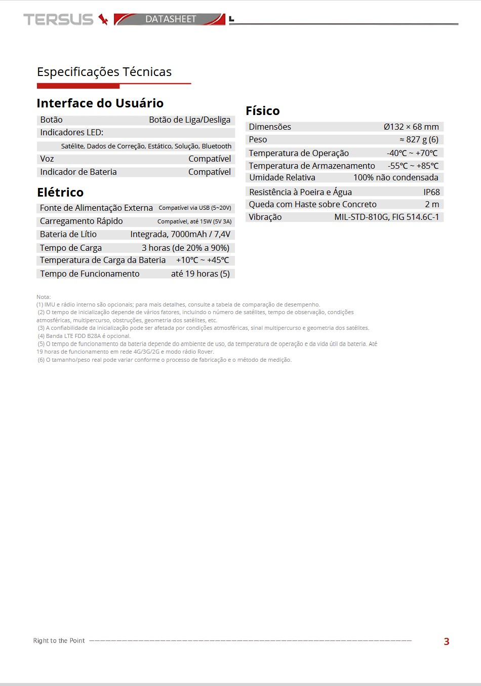Proteção : IP68, MIL‑STD‑810G, queda 2 m, –40 °C a +70 °C, 100 % umidade sem condensação.