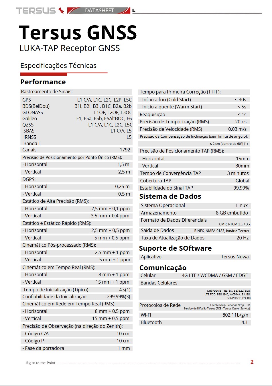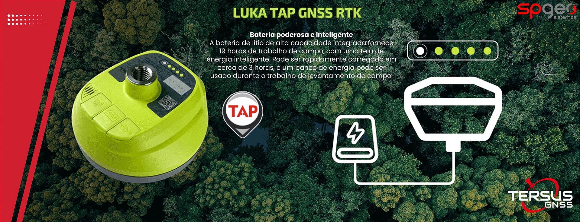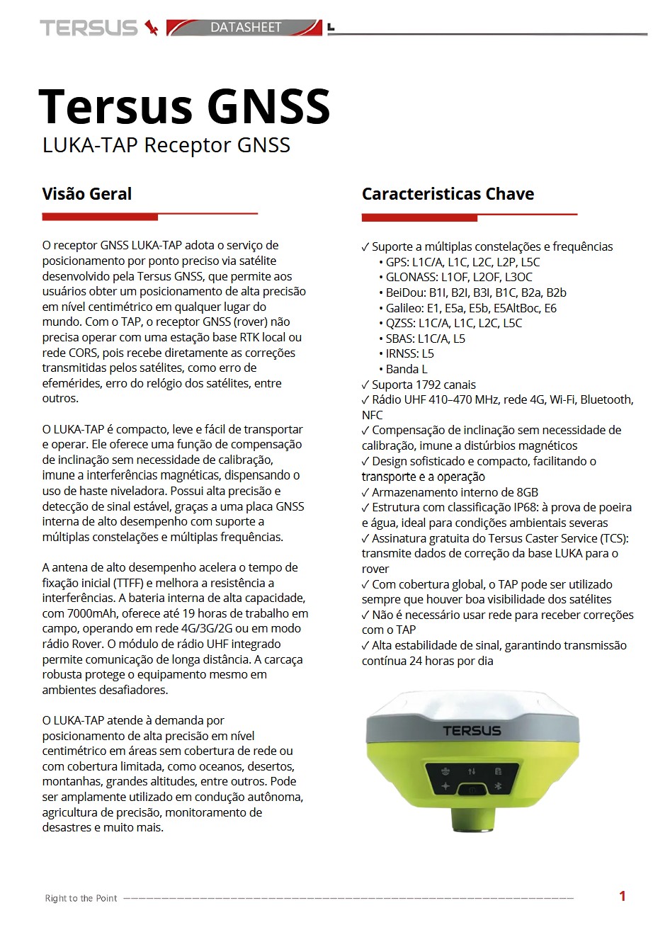 O LUKA-TAP é um receptor GNSS multiconstelação compacto, robusto e de alta precisão, que incorpora o serviço TAP (Tersus Advanced Positioning) de correção via satélite. Com até 1792 canais, compensação de inclinação imune a interferência magnética, bateria de 7000 mAh para até 19 horas de operação, rádio UHF interno, 4G, Wi-Fi, Bluetooth e NFC, é ideal para aplicações avançadas mesmo em locais remotos — sem depender de estação base, rede RTK ou CORS.